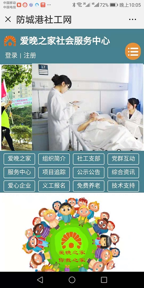 上图为防城港社工网PC版——爱晚之家主页面上部分