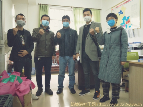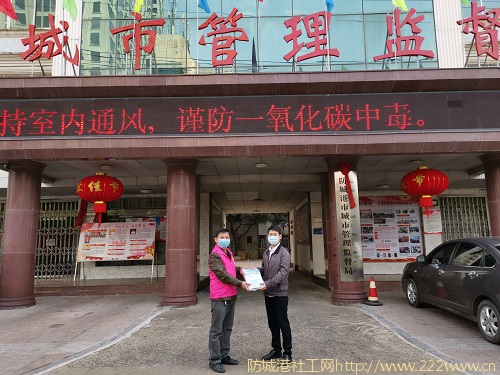 之家社会服务中心在给防城港城市管理局值班工作人员捐赠口罩