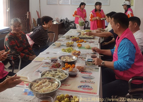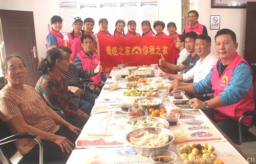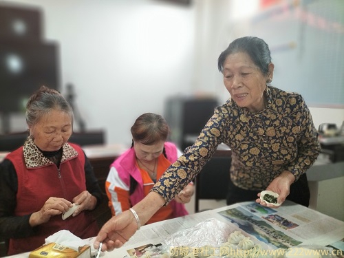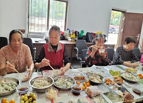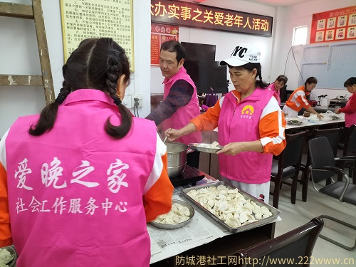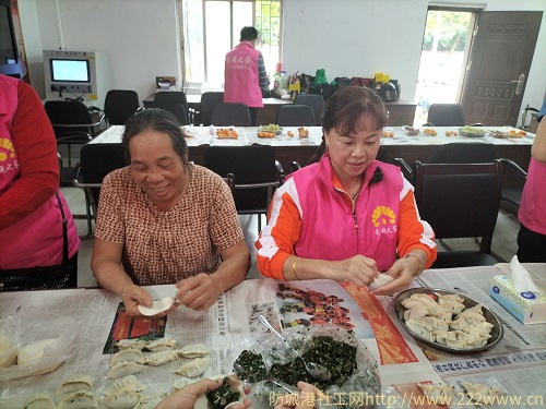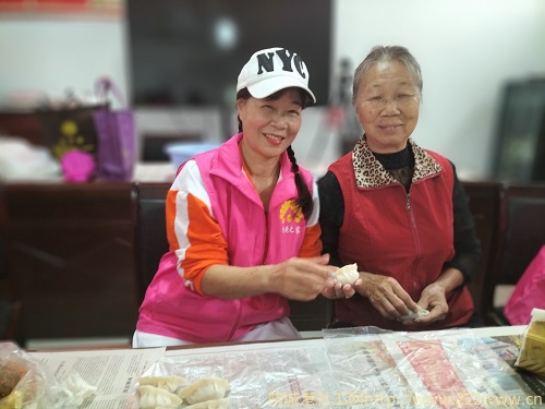 上图为爱晚之家志愿者在陪老人包饺子做午餐