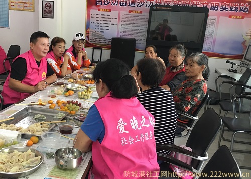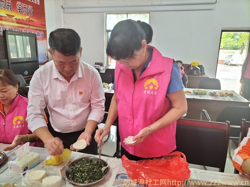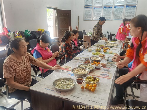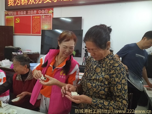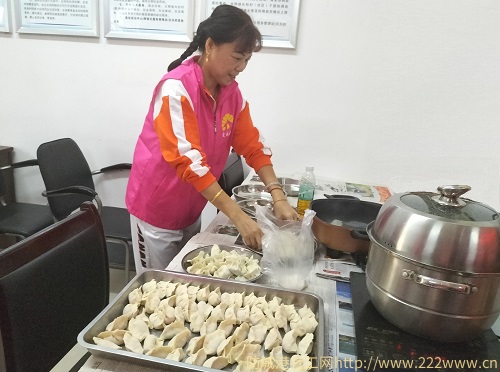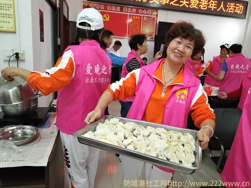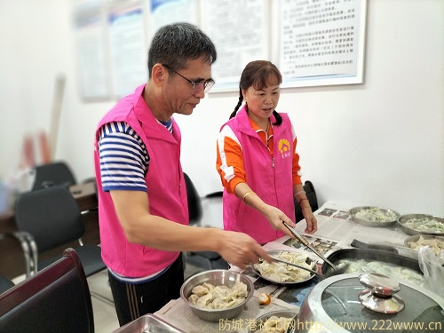 上图为爱晚之家支部党员与志愿者在煮饺子中