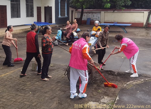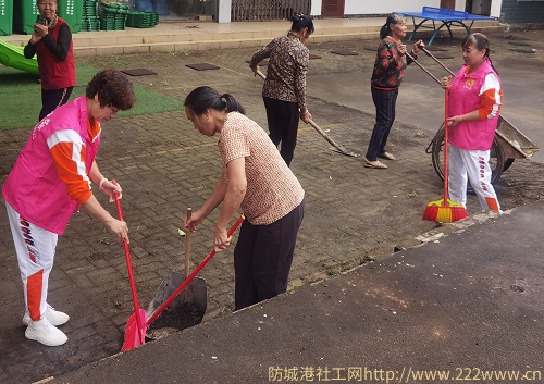 上图爱晚之家党员与志愿者陪老人打扫卫生。