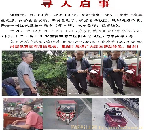 2022年1月7日,当防城港市爱晚之家社会服务中心党支部了解到于本市防城区阳光山水的69岁男性居民谢绍迁自从2021年12月30日连人带车失踪,却一直未寻找到踪迹后,为帮助家属寻亲人、协助警方找线索,党支部便当晚召开会议决定由支部书记施海东同志牵头,由陈红葵、黄文嫦这两名党员骨干协助。党支部次日上午向社会发布公开了《倡议书》倡议社会爱心人士自荐参与,任临时组成建一个“爱心助力寻人志愿工作组”(下面简称“工作组”),推进: