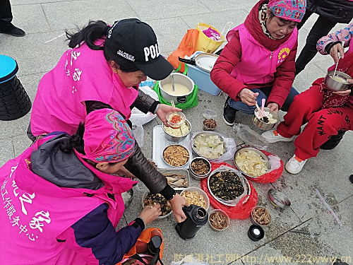 图为志愿者自带午餐途中开饭